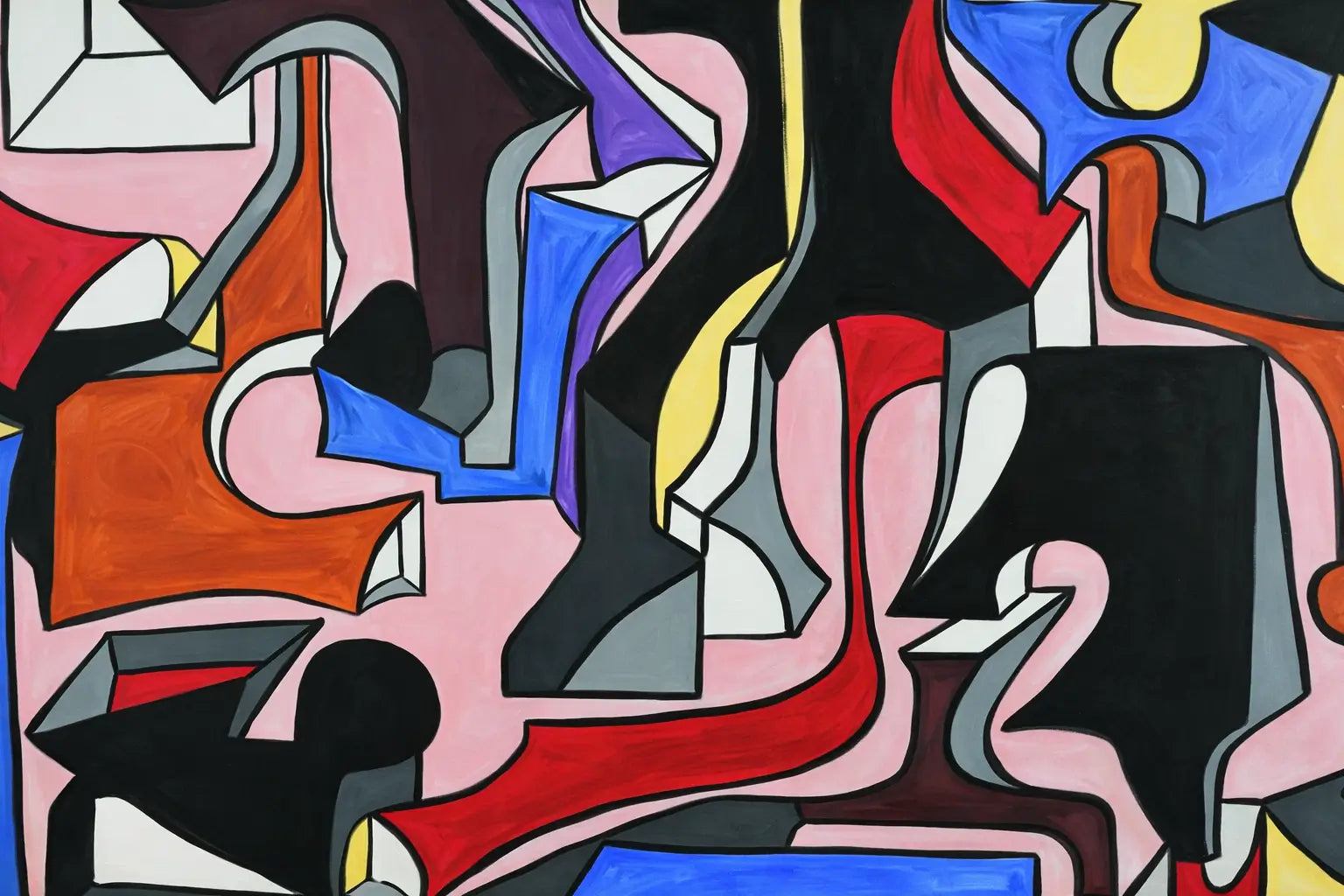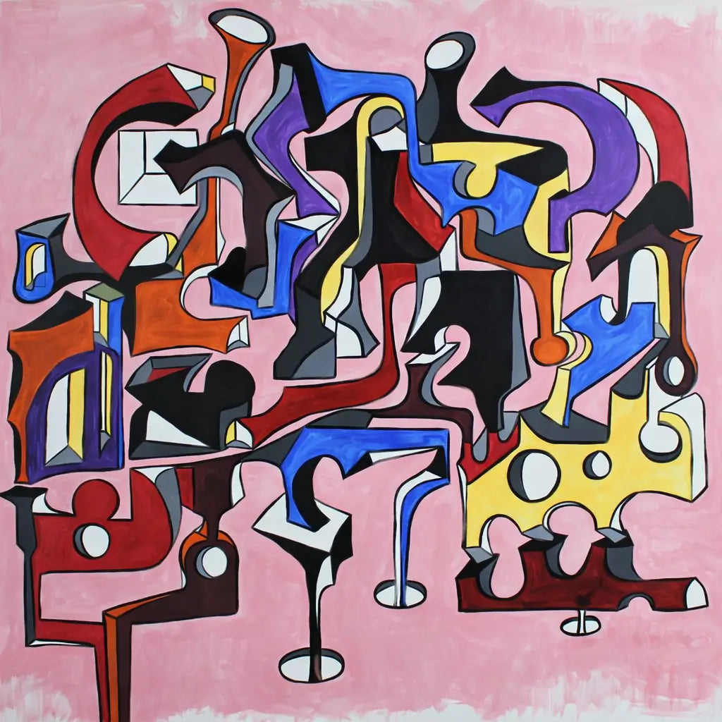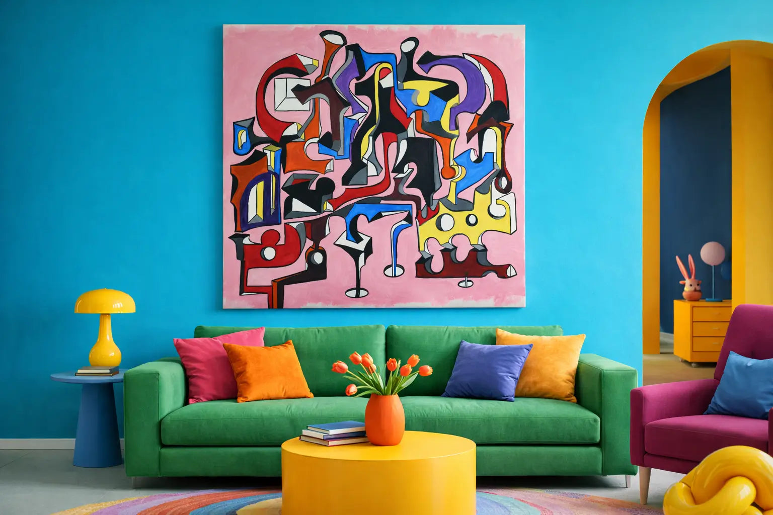 Su composición dinámica y sus formas arquitectónicas la hacen adecuada para interiores modernos, espacios creativos o entornos curados. La interacción de tonos brillantes sobre un fondo suave crea energía visual al tiempo que mantiene el equilibrio.